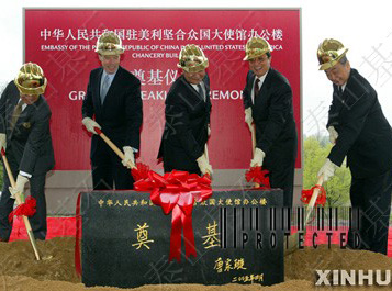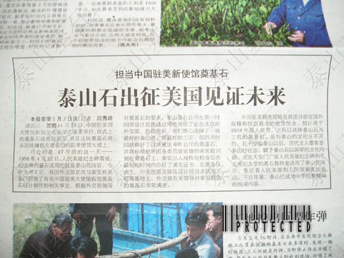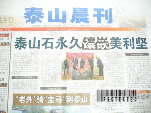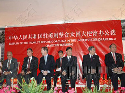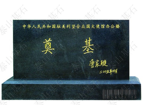 2005年4月22日,中國駐美國大使館新館舍奠基儀式隆重舉行,儀式上的奠基石就來自泰安,并且這塊奠基石將永遠(yuǎn)被鑲嵌在建成后的駐美使館大樓上。巧合的是,47年前的這一天--1958年4月22日,人民英雄紀(jì)念碑落成,紀(jì)念碑的基石選用的就是泰山花崗巖。今年3月2日,我國外交部首次與泰安有關(guān)部門對接了有關(guān)中國駐美大使館新館舍奠基石設(shè)計(jì)制作的相關(guān)事宜,根據(jù)外交部領(lǐng)導(dǎo)對奠基石的要求,泰山基石公司在第一時(shí)間將設(shè)計(jì)思路通過網(wǎng)絡(luò)傳給了遠(yuǎn)在北京的外交部,經(jīng)批準(zhǔn)后,公司精心選擇了一塊泰山青,用最好的工匠,用一個(gè)星期就做好了這塊重達(dá)600公斤的奠基石,并高標(biāo)準(zhǔn)地將國務(wù)委員唐家璇的親筆題詞刻在奠基石上。在奠基儀式上,中美政要及華裔著名建筑設(shè)計(jì)師貝聿明為工程奠基培土,外交部領(lǐng)導(dǎo)對公司提供的奠基石非常滿意。 中國駐美大使館將是我國目前在國外規(guī)模最大館舍,預(yù)計(jì)將于2008年投入使用。之所以選用泰山石為工程的奠基石,是與泰山的文化分不開的?鬃拥桥R泰山以后,歷代文人墨客登泰山抒壯志,賦予泰山石以深厚的文化內(nèi)涵。北京天安門廣場、人民英雄紀(jì)念碑、人民大會堂的基石都特意選用了泰山花崗巖,象征著穩(wěn)如泰山。千百年來,泰山已成為中華民族精神的組成內(nèi)容。